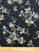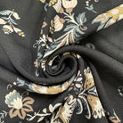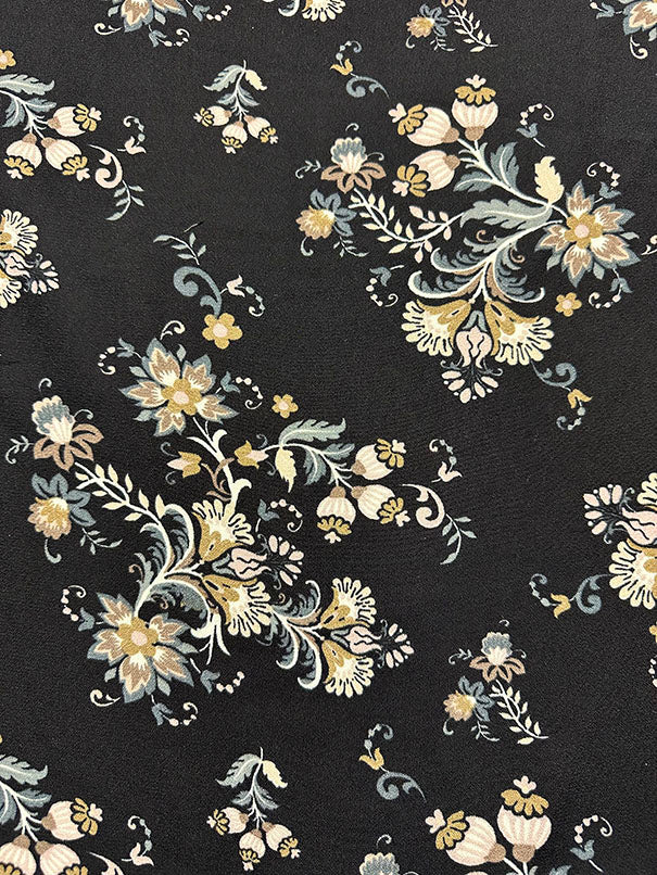 -Tan, Beige, White, & Green Multi Floral Print on Black Light Weight Dress Crepe Fabric