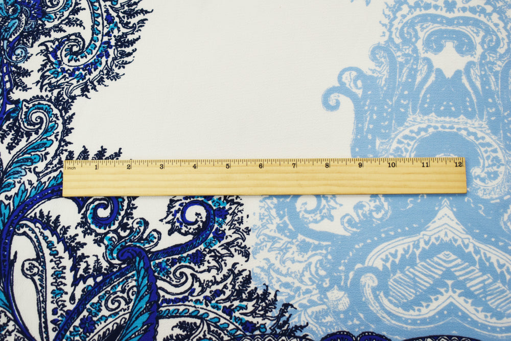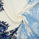 White-Blue-Black Poly Baroque Border Printed Pebble Crepe Woven Fabric