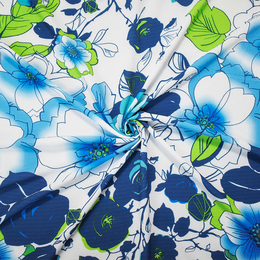 White-Blue-Multi Poly Floral Printed Pebble Crepe Woven Fabric