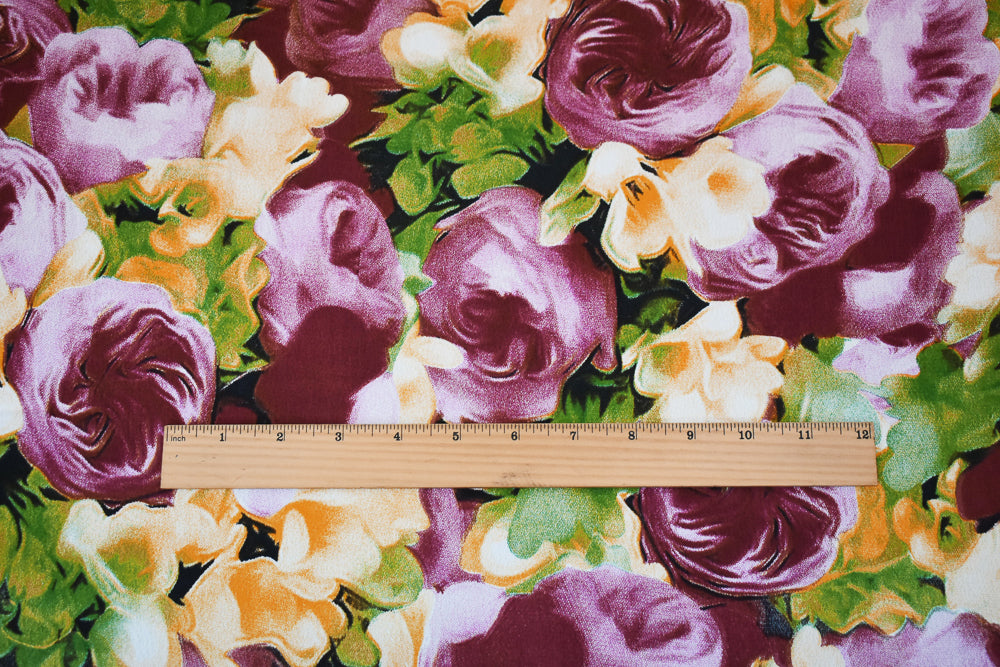 Maroon-Yellow-Multi Floral Printed Rayon Crepe Faille Woven Fabric