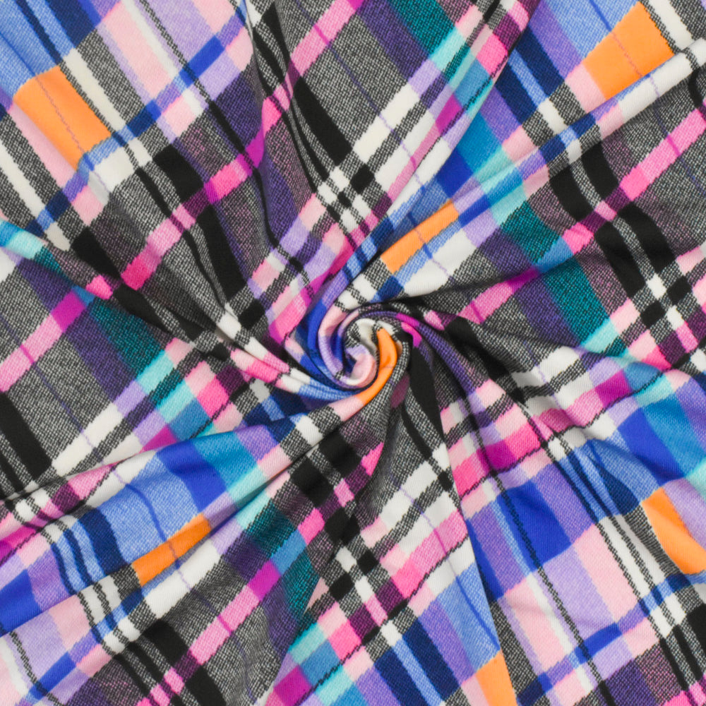 Black-Purple-Multi Plaid Printed Stretch Polyspan Jersey Knit Fabric