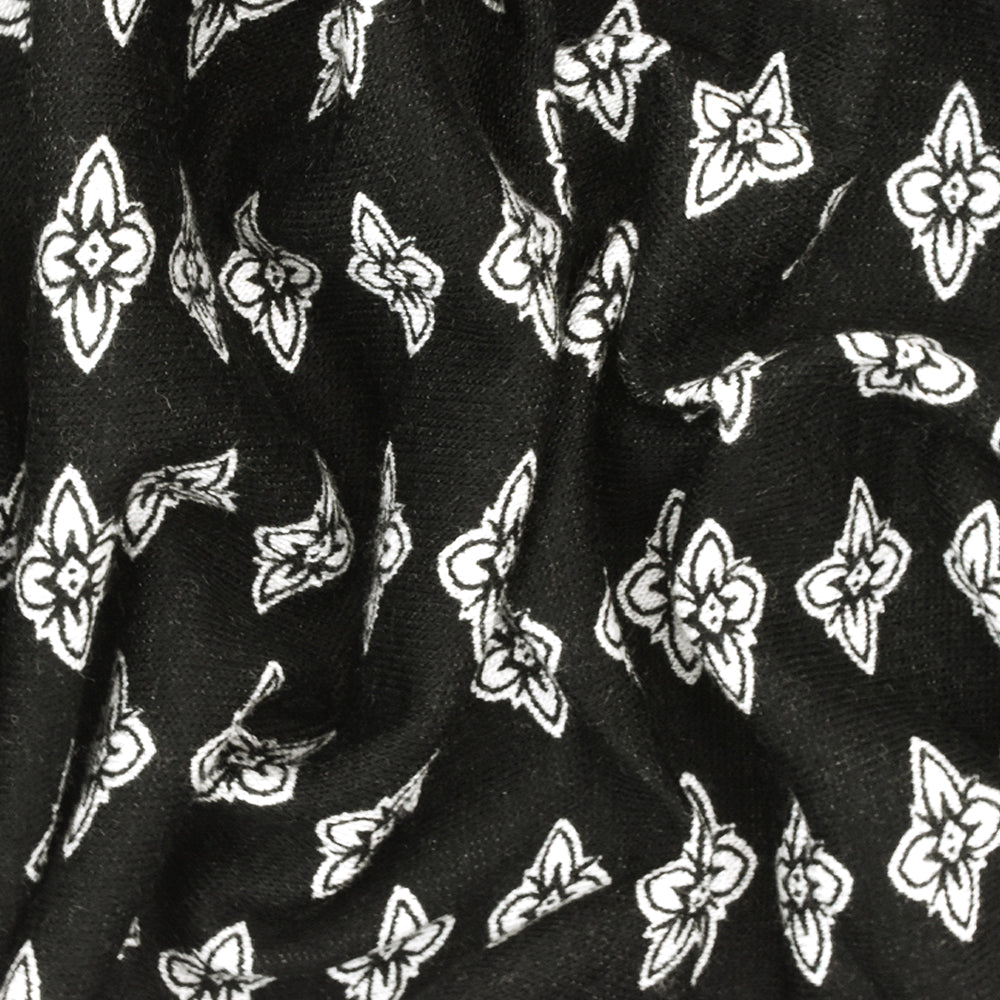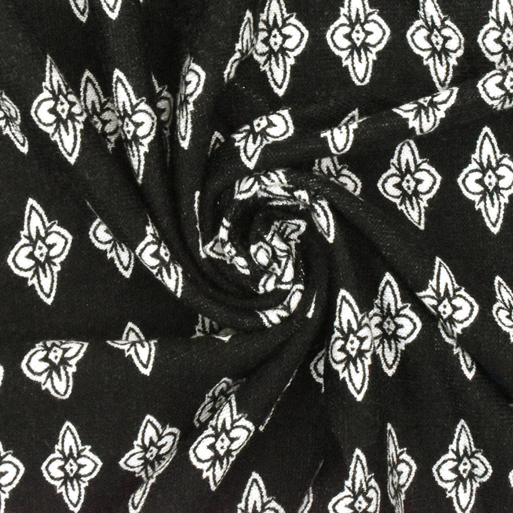 Black-White Floral Border Printed Rayon Stretch Jersey Knit Fabric