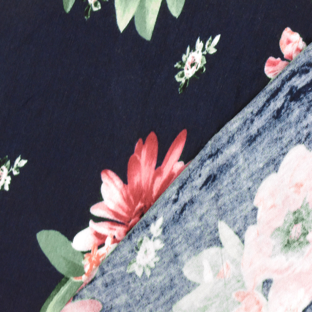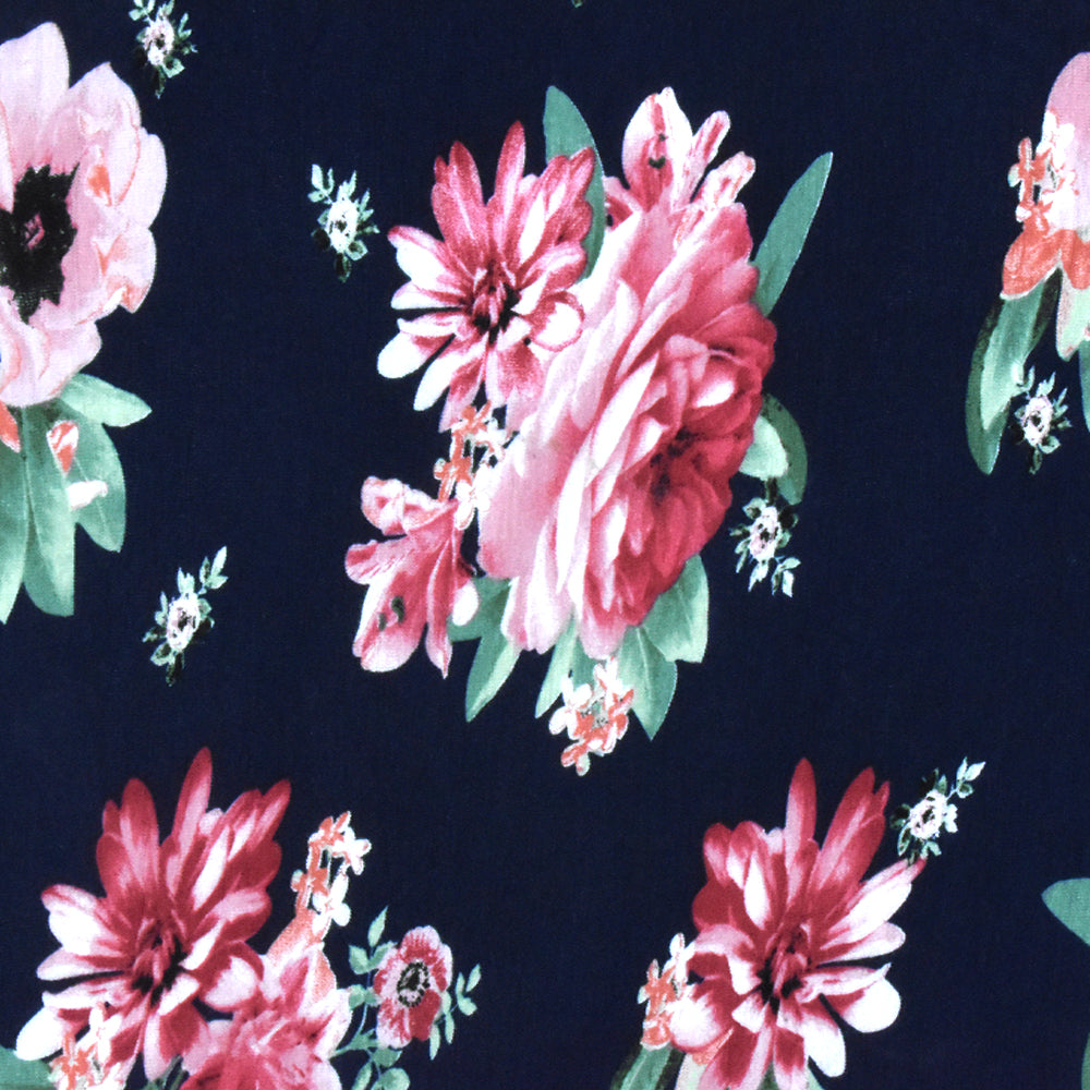 Deep Navy-Pink-Multi Floral Printed Rayon Stretch Jersey Knit Fabric