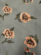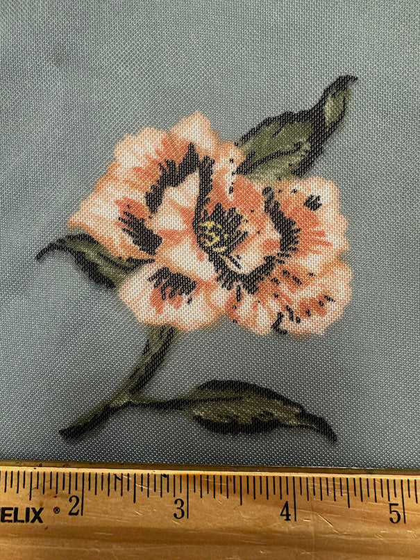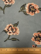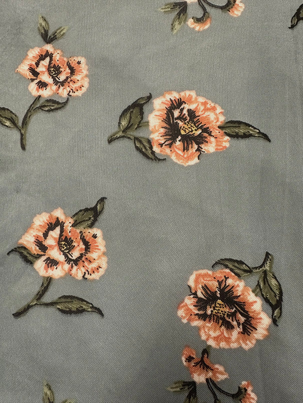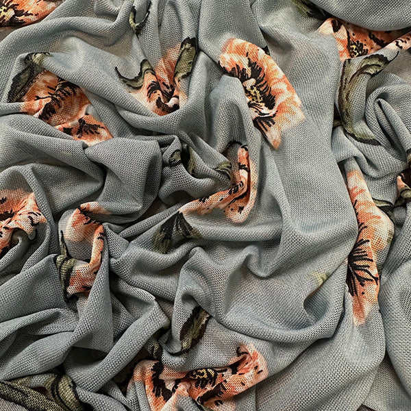 -Coral, Peach, White, Black, & Green Floral Print on Pale Blue Stretch Mesh Fabric