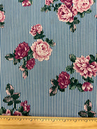 -Pink Red, & Green Floral on Blue & White Stripe Print Double Brushed Jersey Knit Fabric