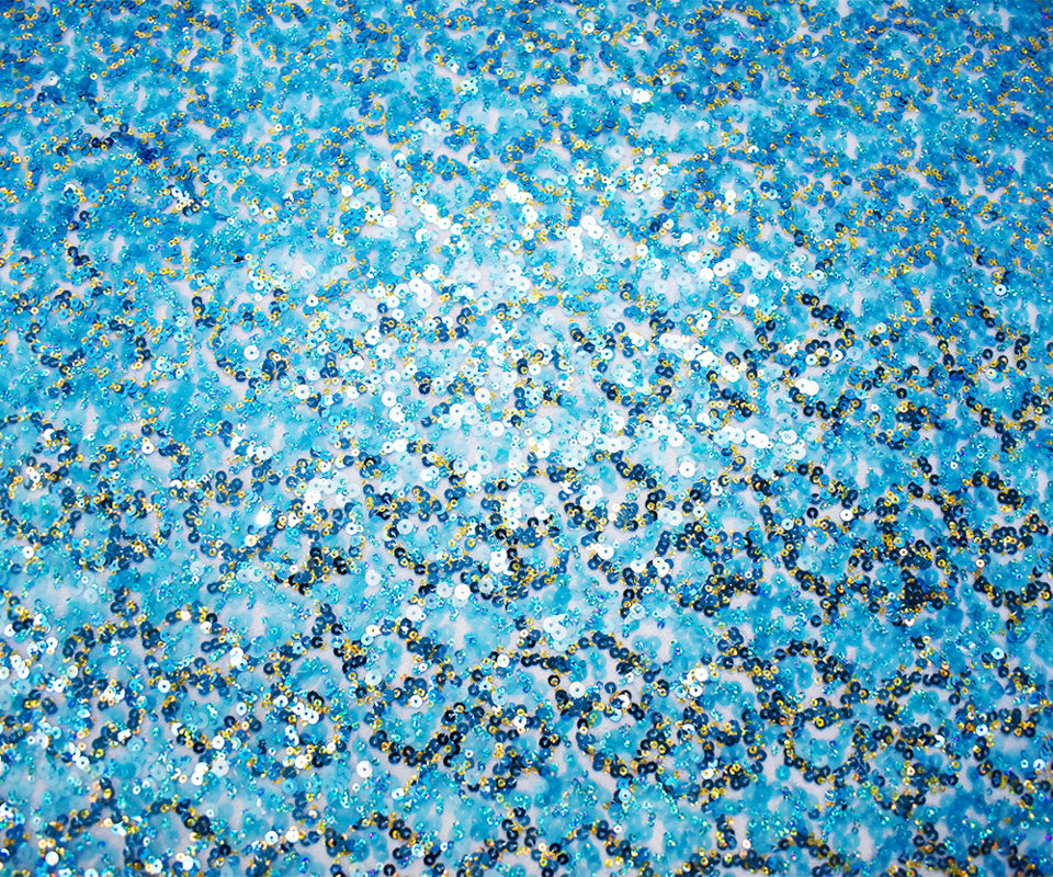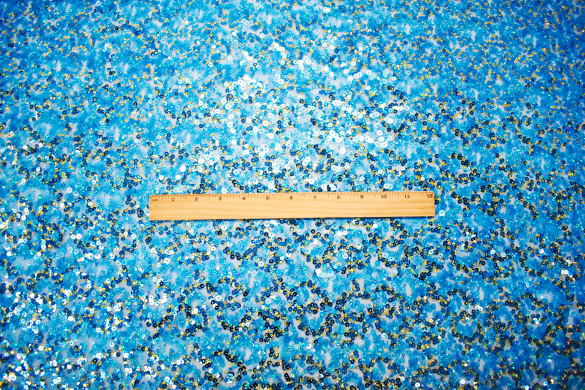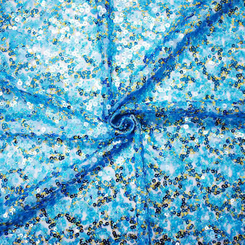 -100% Polyester tulle mesh fabric with scattered sequins in various colors and shapes