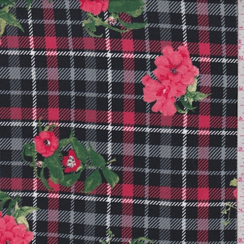 Black/Coral Plaid Floral Double Brushed Jersey Knit Fabric