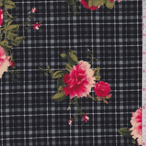 Black/Raspberry Plaid Floral Double Brushed Jersey Knit Fabric
