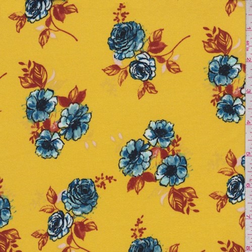 Golden Yellow/Blue Floral Cluster Double Brushed Jersey Knit Fabric