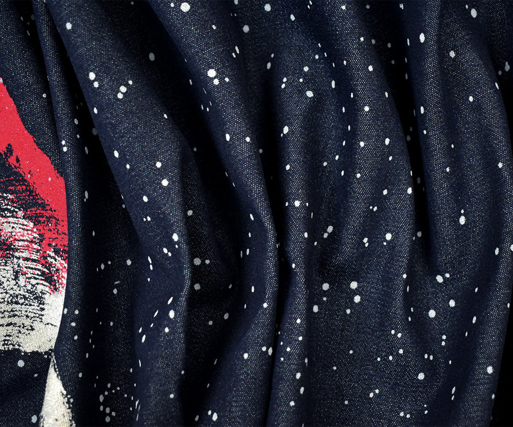-8 oz. cotton stretch spandex denim fabric printed with random dots and an abstract painterly like motif