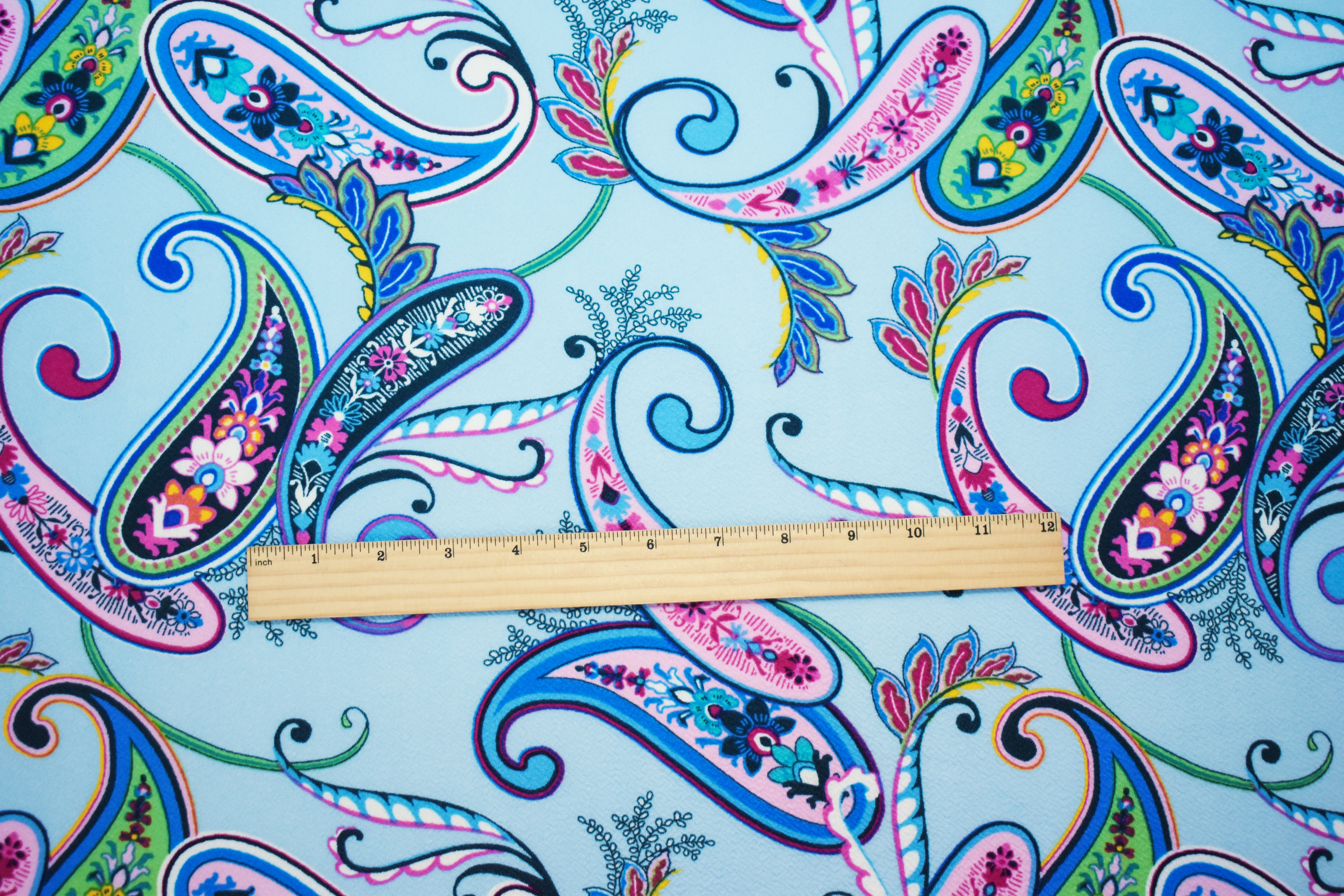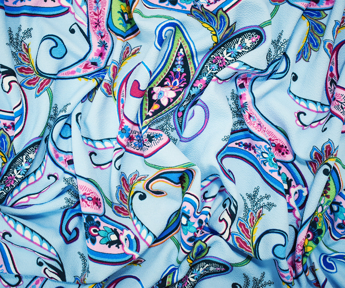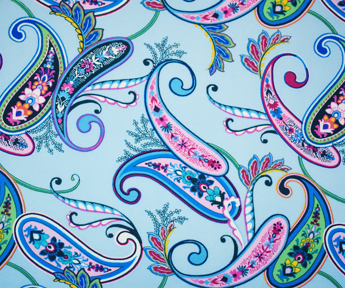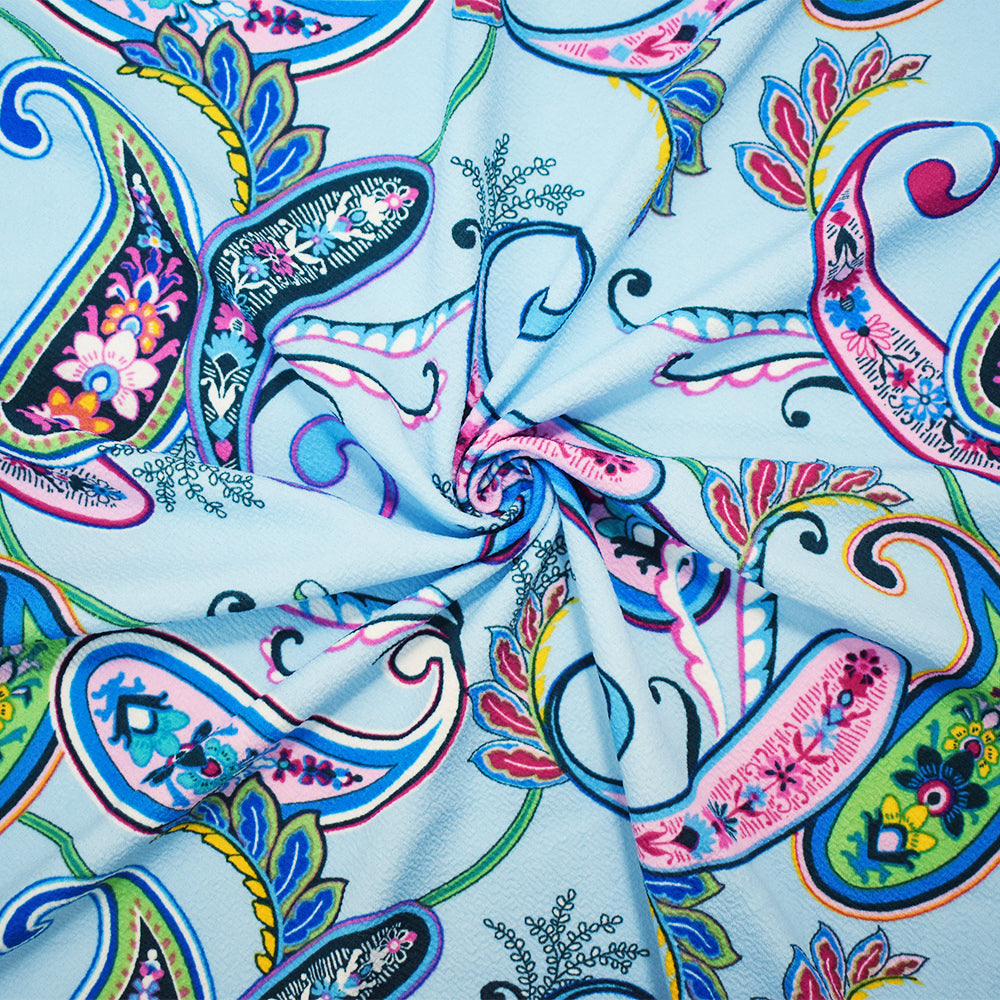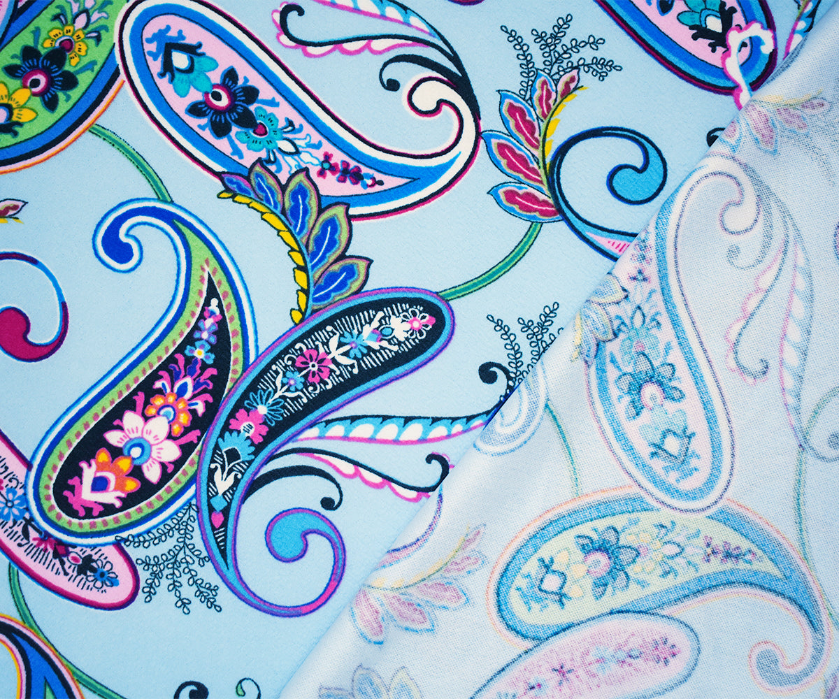-Polyester Stretch spandex textured Liverpool double knit fabric printed with a paisley pattern