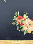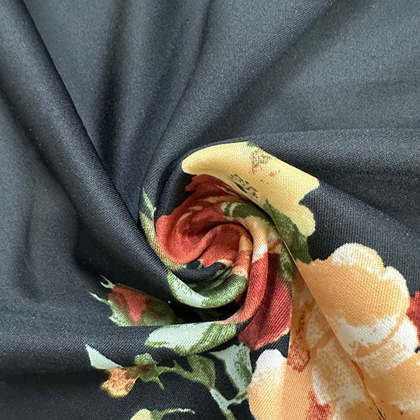 -Rust, Yellow, Peach, White, Green, & Red Floral Print on Black Scuba Double Knit Fabric