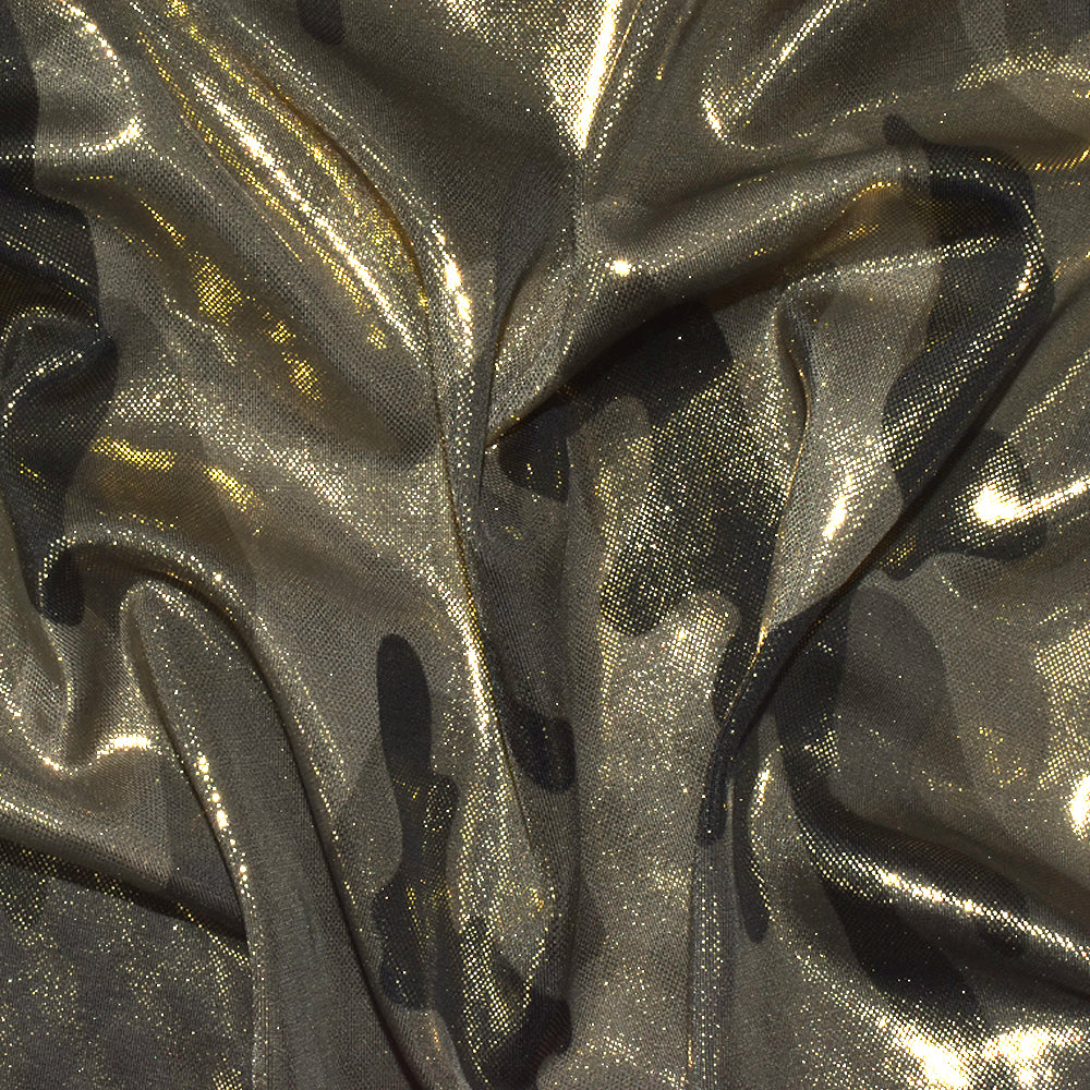 -260 GSM, metallic gold micro dots foil-over printed on a camouflage print from a famous activewear company, made in Brazil