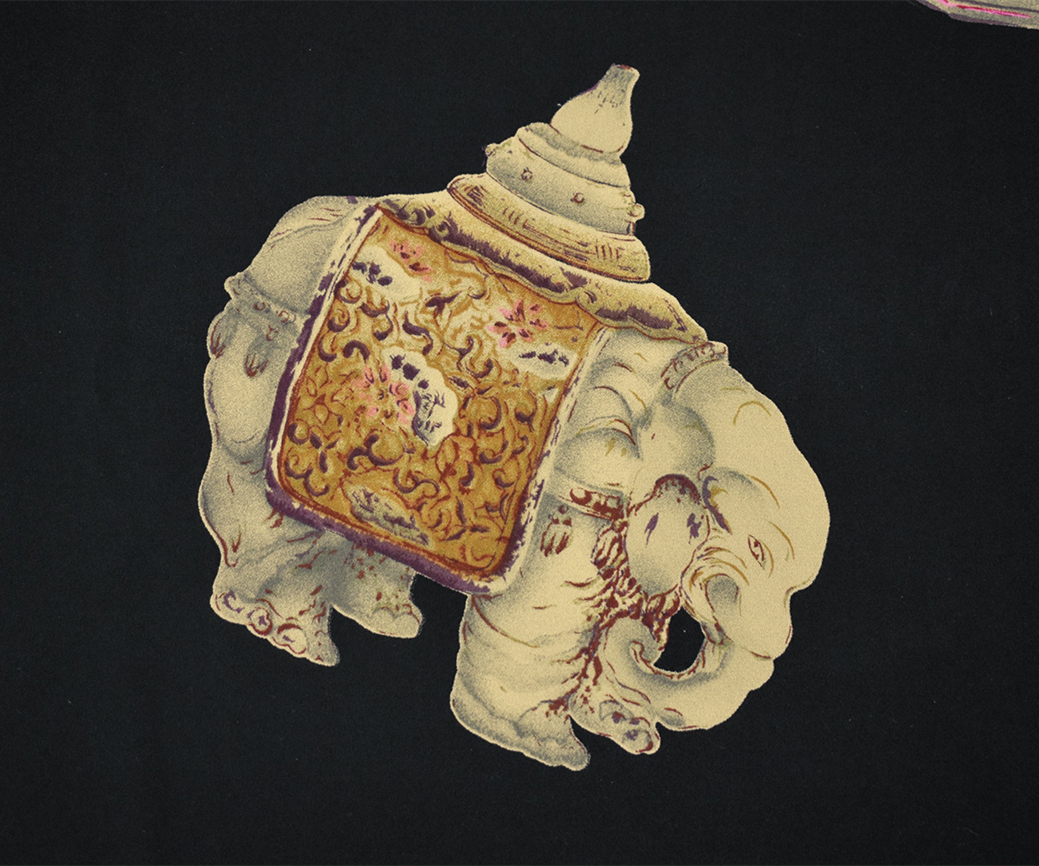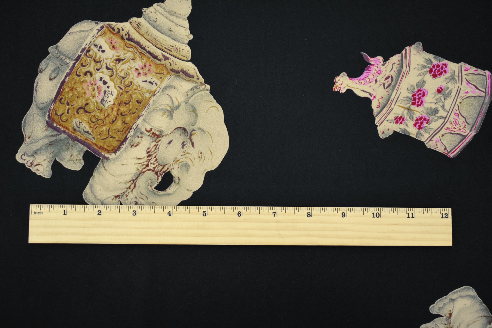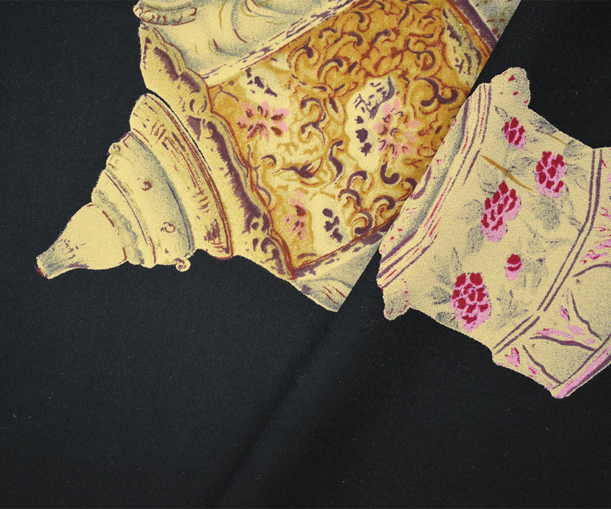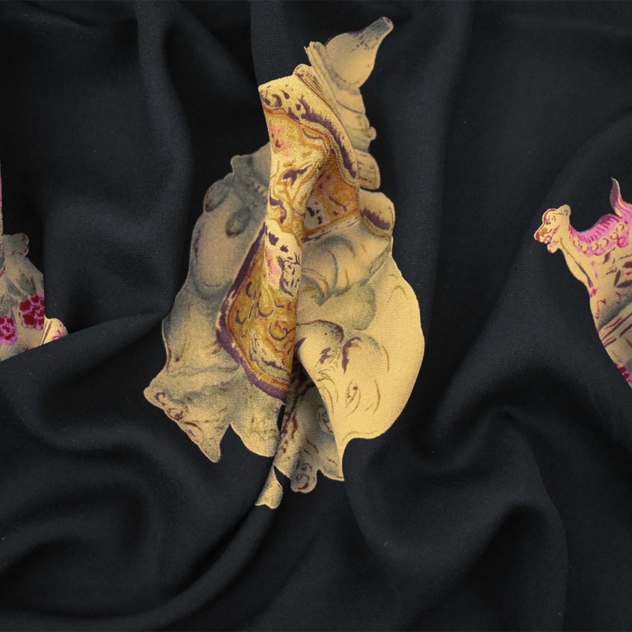 -100% Silk georgette woven fabric printed with various ceramic figurines featuring florals, elephant, and other creatures.