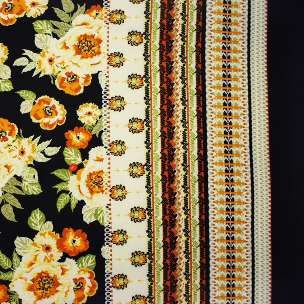 -Black-Multi Poly Floral Border Printed Crepe Momie Georgette Woven Fabric