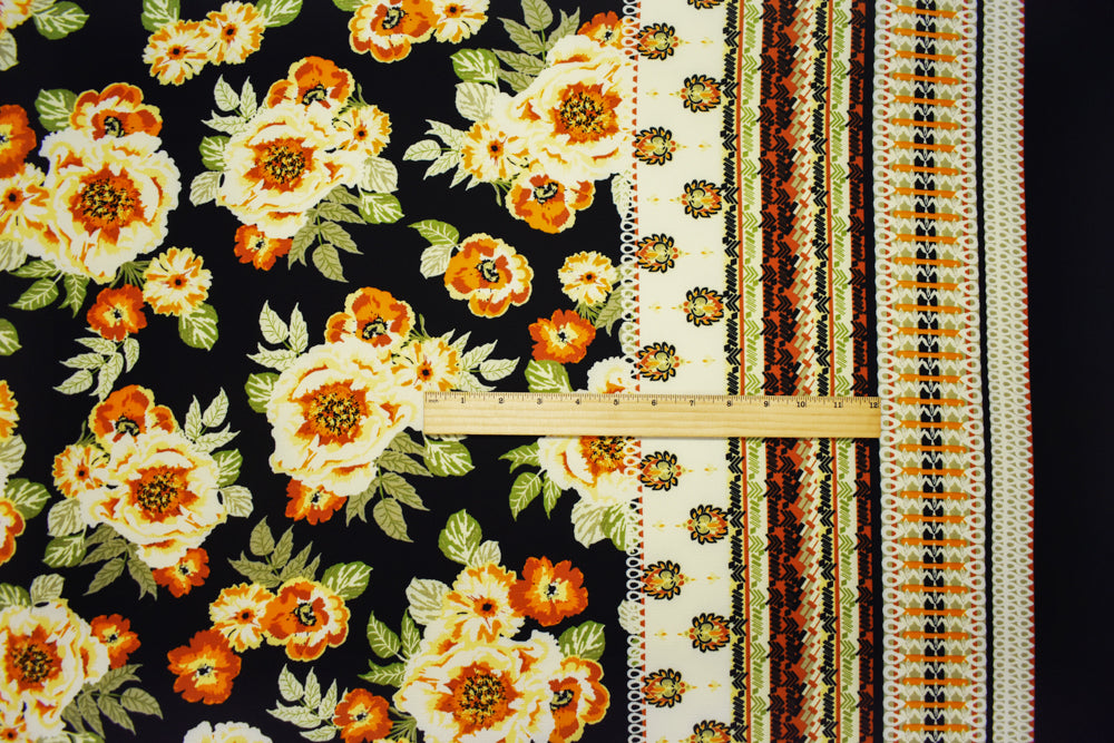 Black-Multi Poly Floral Border Printed Crepe Momie Georgette Woven Fabric
