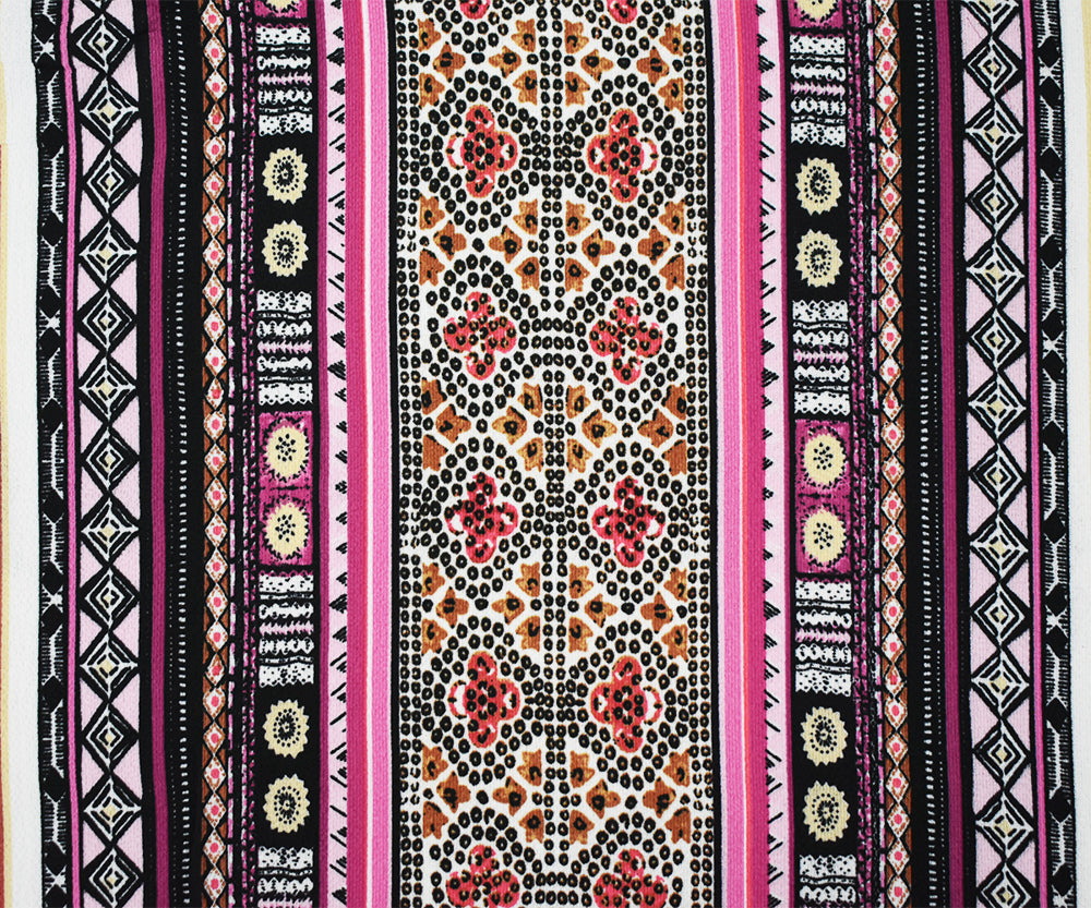 -100% polyester crepe textured georgette woven fabric printed with Aztec inspired patterns in a striped arrangement