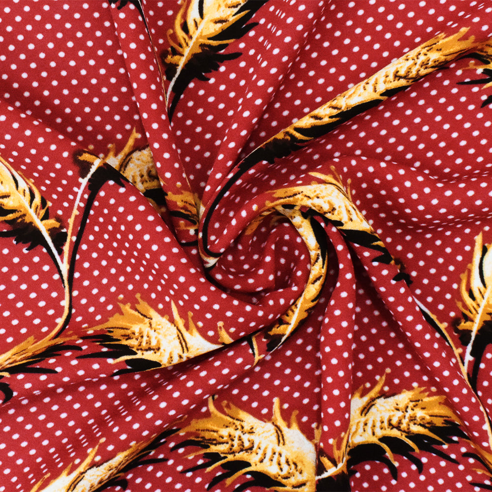 Red-Yellow-Multi Feather And Dot Printed Poly Georgette Woven Fabric