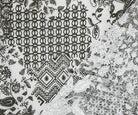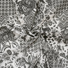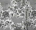 -100% Polyester lace mesh knit fabric printed with a patch-like pattern featuring florals, trellis, and Aztec-inspired elements.