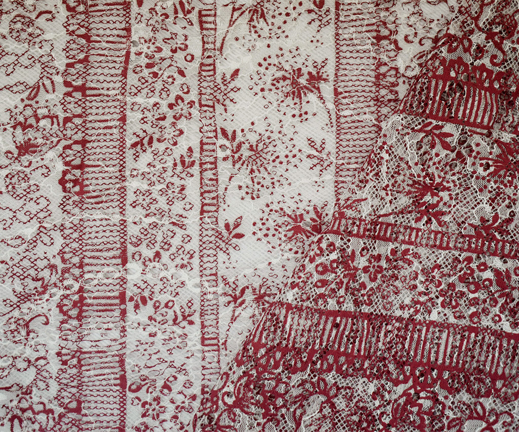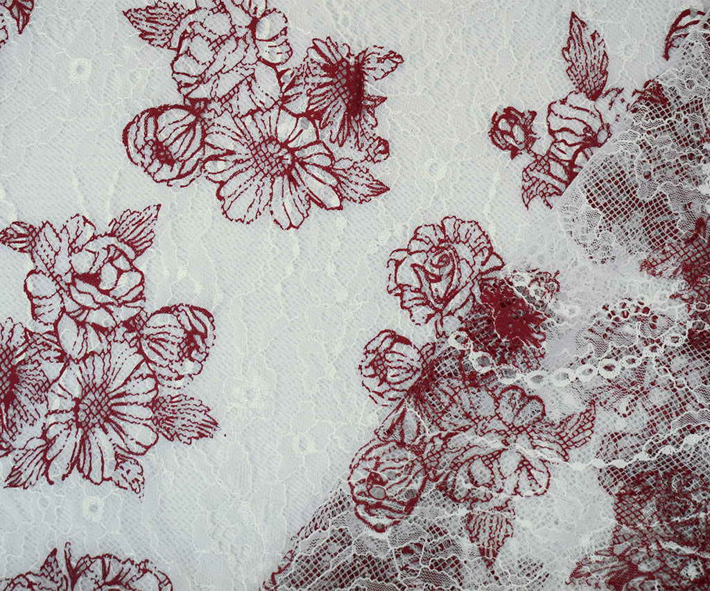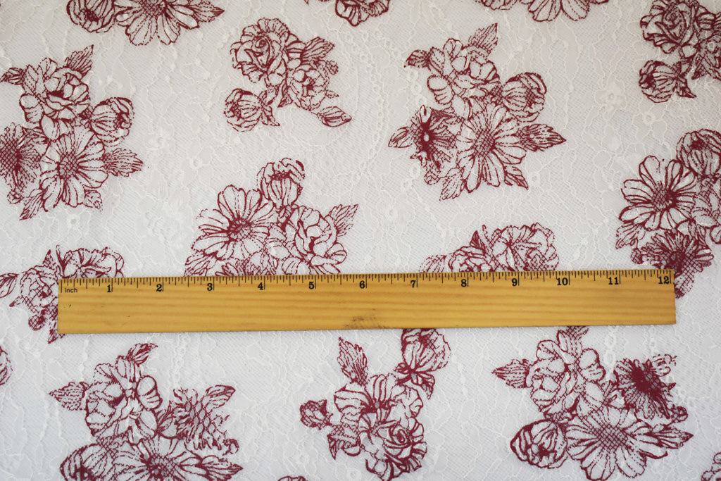 White-Deep Red Nylon Floral Vine Printed Lace Mesh Knit Fabric