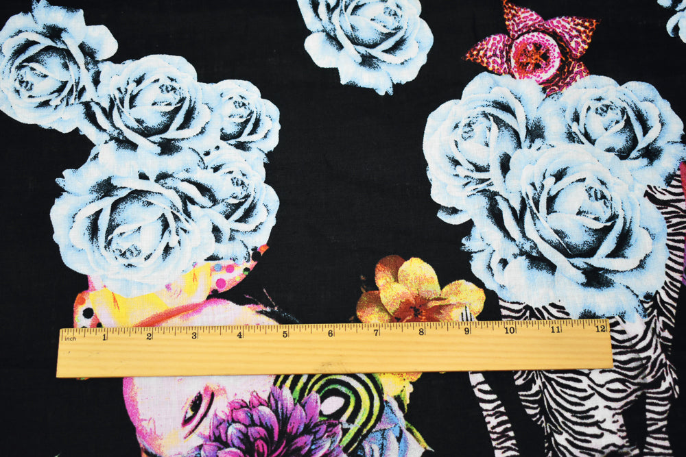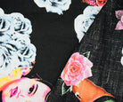 Black-Magenta-Multi Faces and Floral Printed Linen Woven Fabric