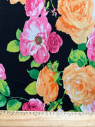 -Shades of Pink & Orange, White, & Green Roses Print on Black ITY Jersey Knit Fabric