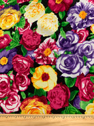 -Purple, Pink, Gold, Yellow, White, & Green Multi Floral Print on Black Rayon Challis Fabric