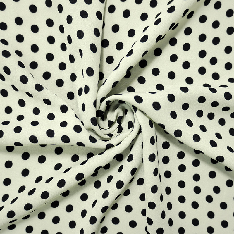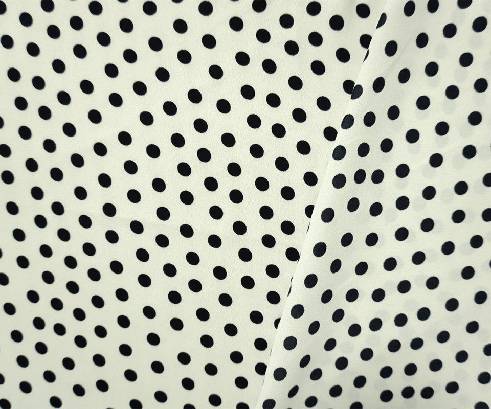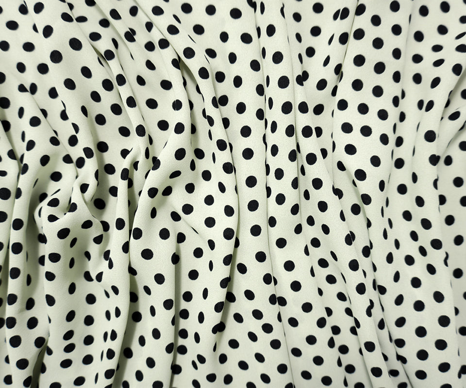 -This poly georgette showcases a dot print on a sheer, slightly textured woven ground. The fabric's fluid drape and delicate appearance make it suitable for layered blouses and romantic apparel.