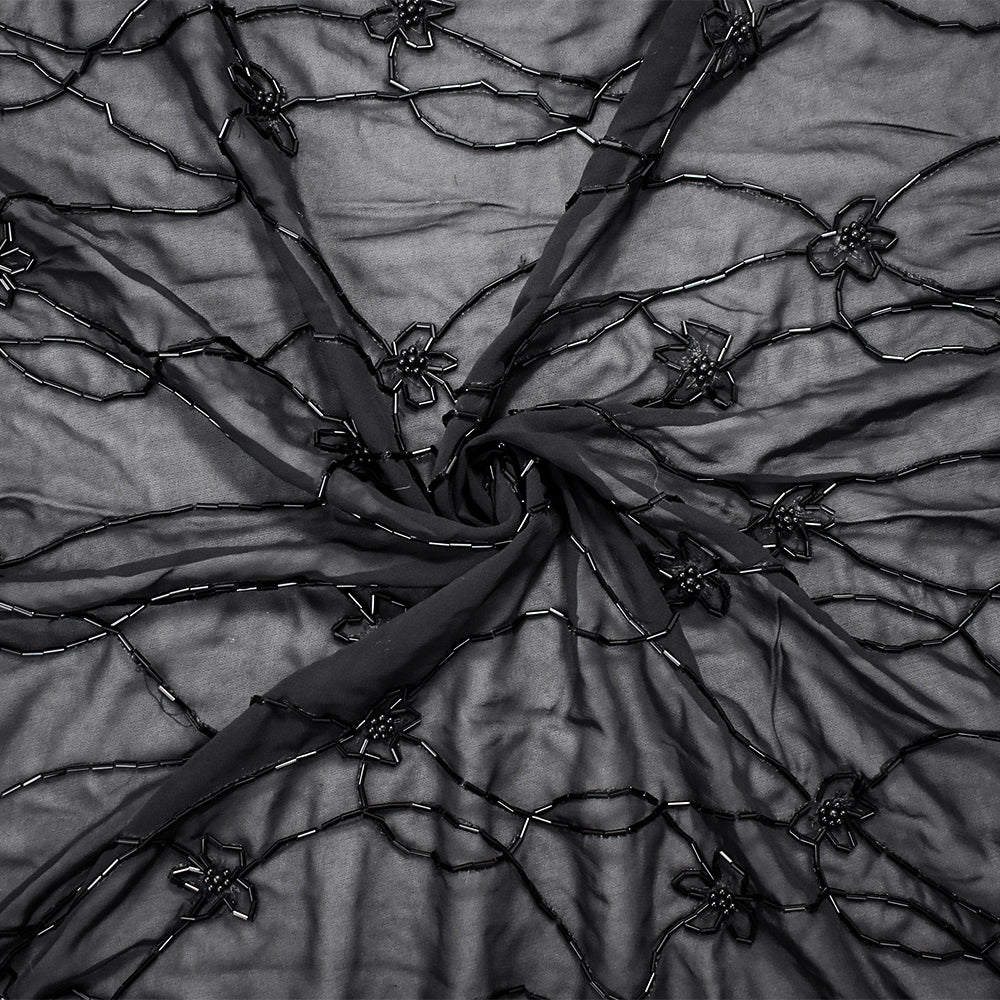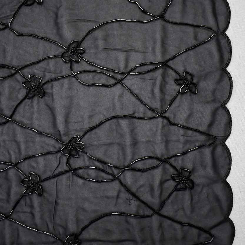 Black Polyester Beaded Floral Vine Embroidered Scallop Chiffon Woven Fabric