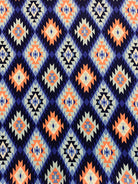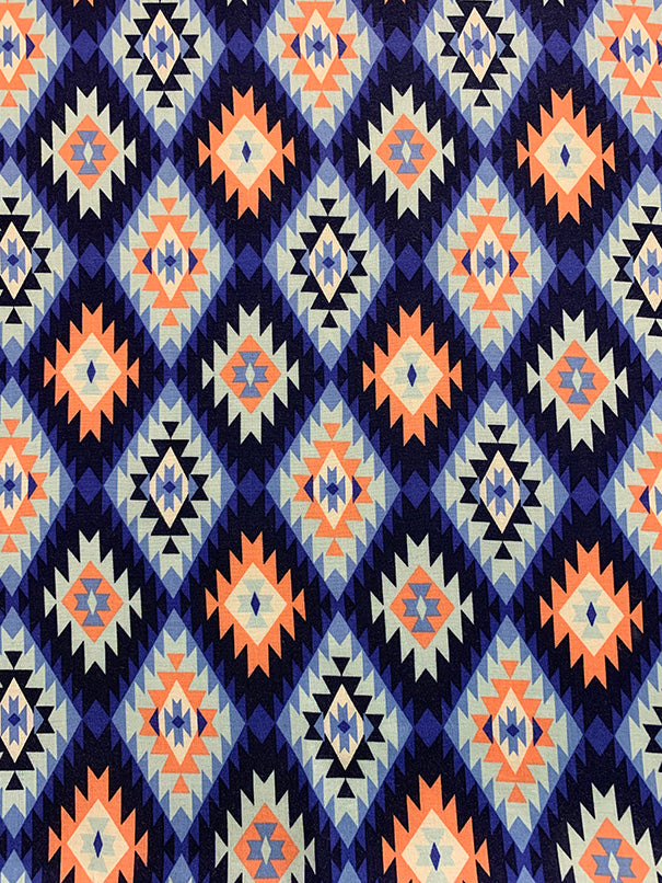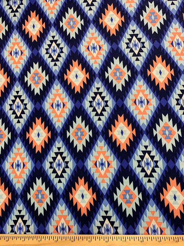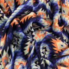 Blue and Coral Aztec Print Rayon Challis Fabric