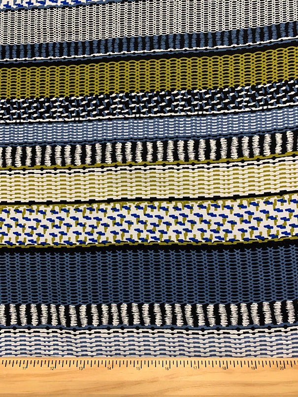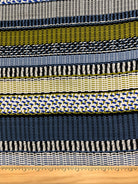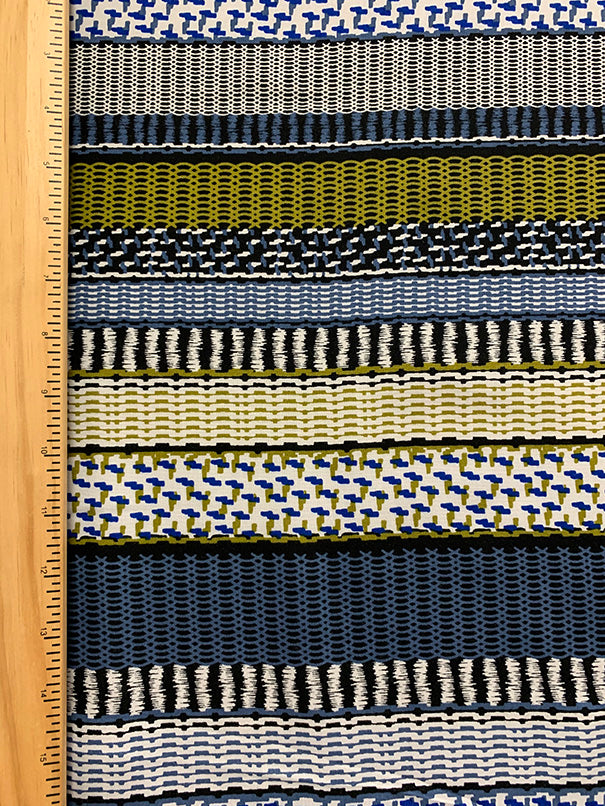 -Blue, Gold, Black, & White Multi Stripe Print Rayon Challis Fabric
