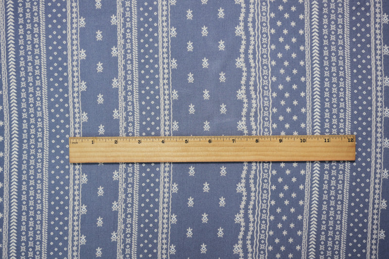 -This rayon fabric showcases a nordic inspired pattern in a vertical striped arrangment printed on a fluid challis base. The soft, lightweight construction drapes beautifully, perfect for creating unique, flowing garments