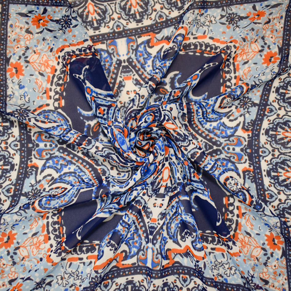 -Blue-White-Orange Poly Moroccan Bandana PANEL Printed Chiffon Woven Fabric