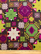 -Orange, Magenta, Green, Yellow, Light Beige, Fuschia, & Brown Multi Print Rayon Challis Fabric