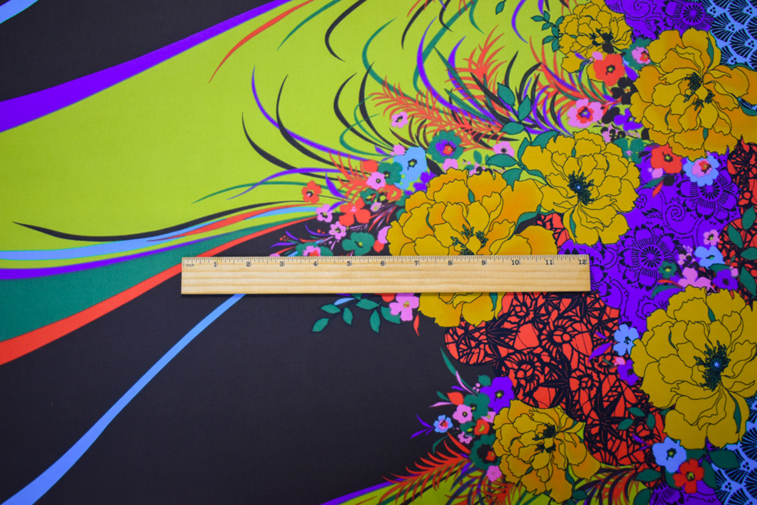 Brown-Yellow-Multi Poly Floral Border Printed Dull Charmeuse Satin Woven Fabric