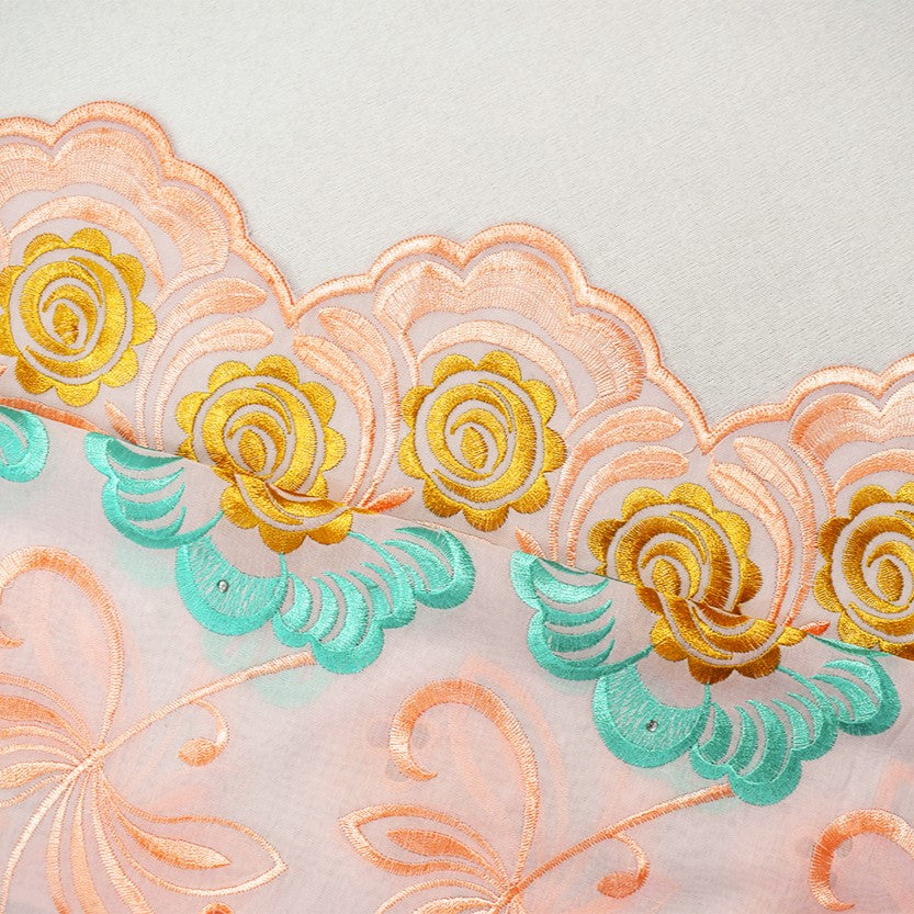 Coral Orange-Teal-Multi Poly-Cotton Floral Embroidered Scallop Eyelet Woven Fabric