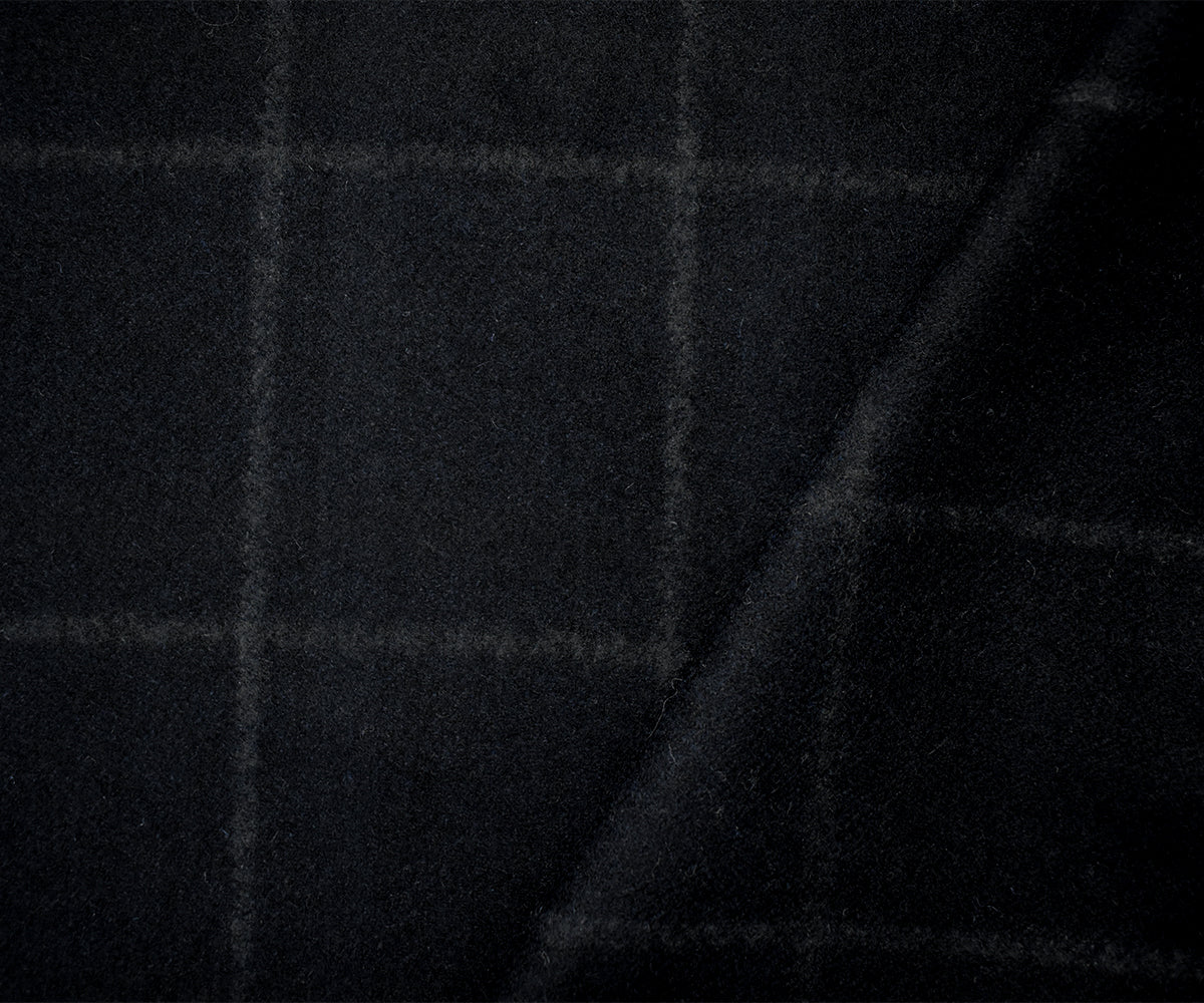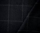 -Check-plaid patterned woven jacketing in wool with compact texture and dimensional pattern. Provides warmth and distinctive character for traditional coating applications.