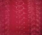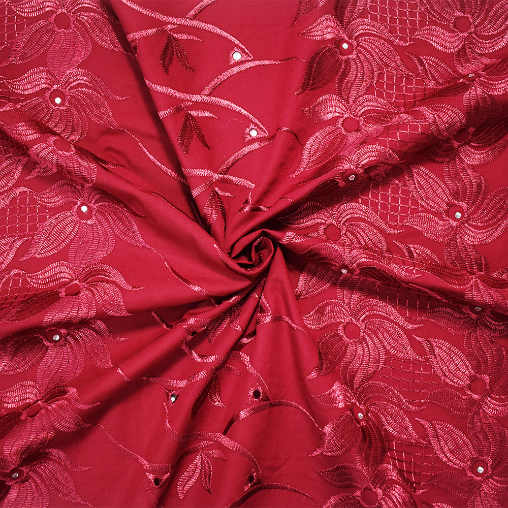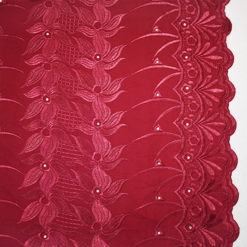 Deep Red Poly-Cotton Embroidered Floral Scallop Rhinestone Woven Fabric