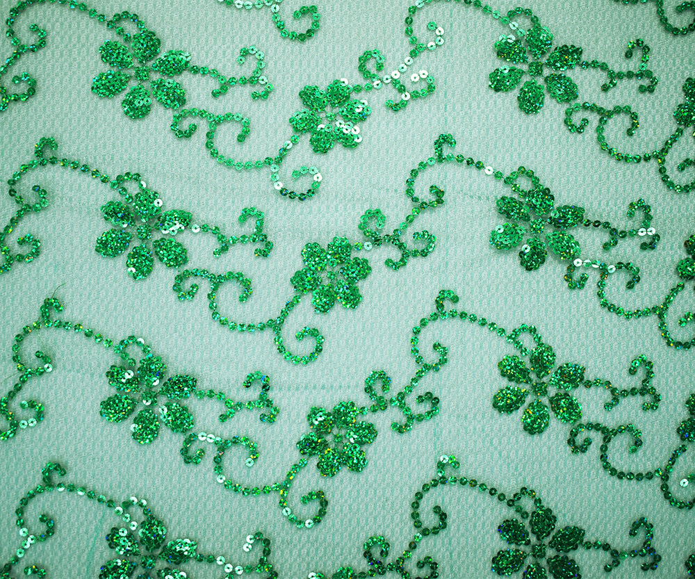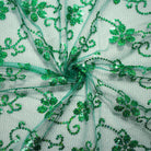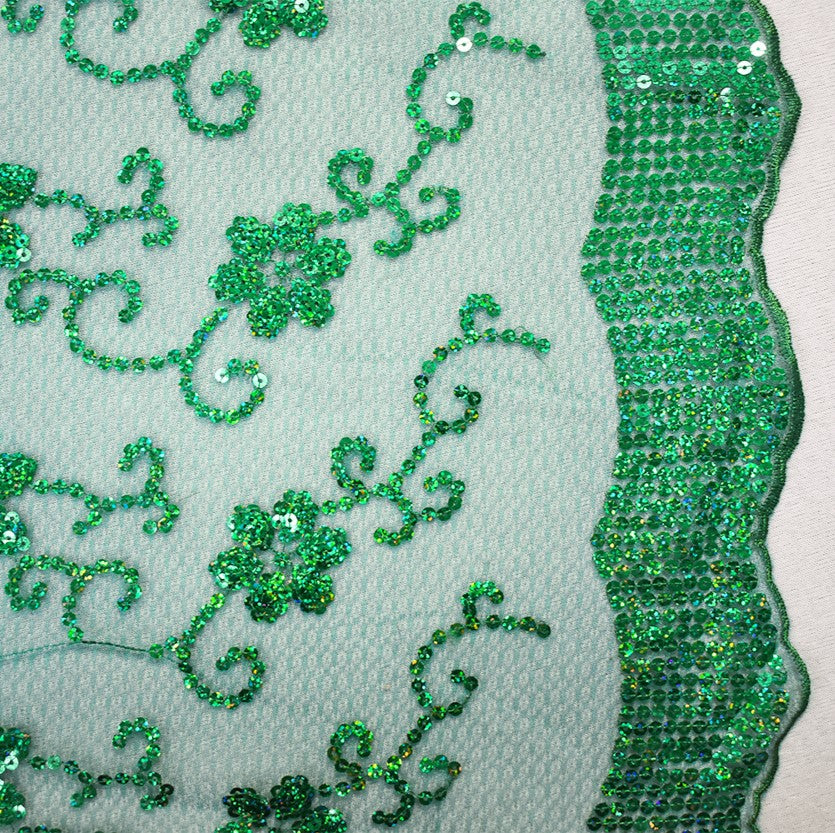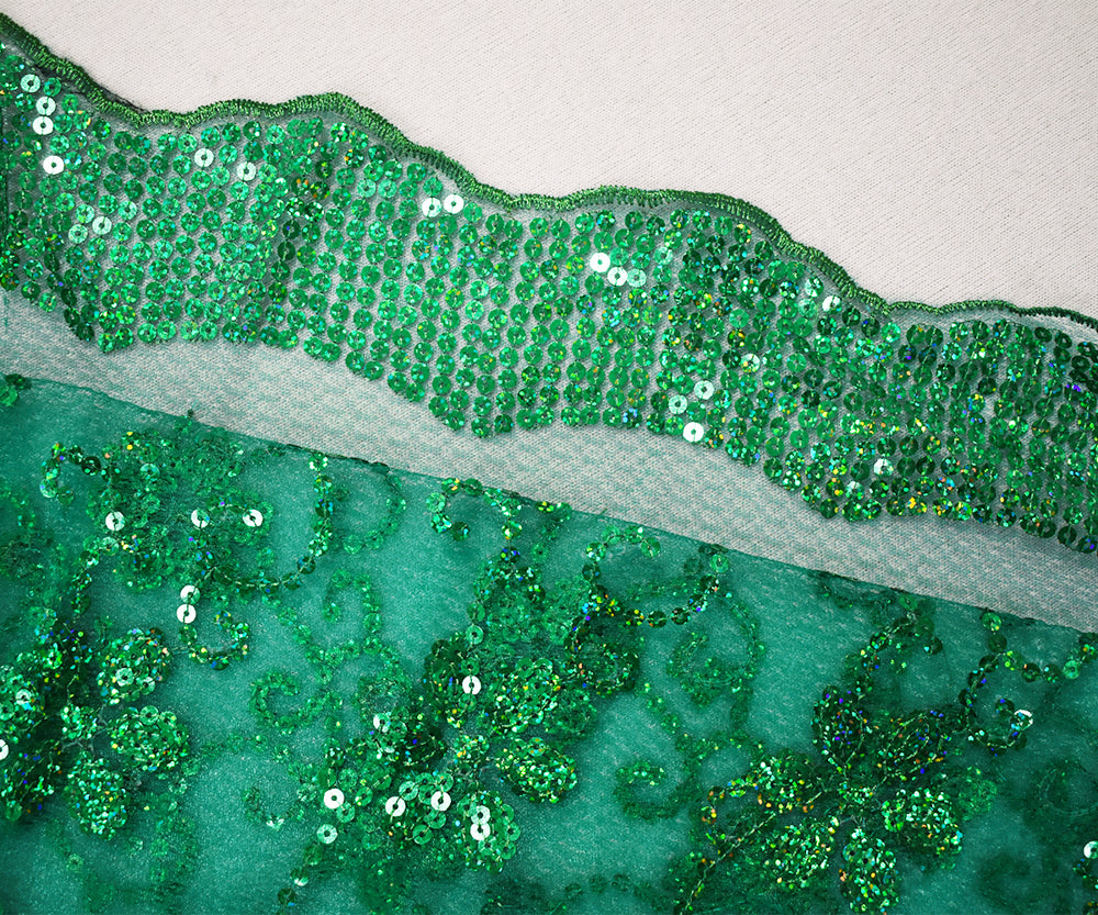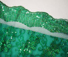 Green Nylon Embroidered Floral Sequin Scallop Tulle Mesh Fabric