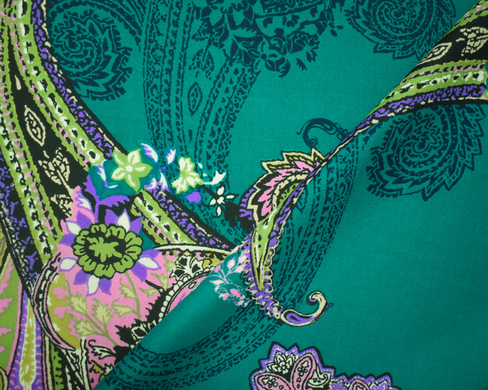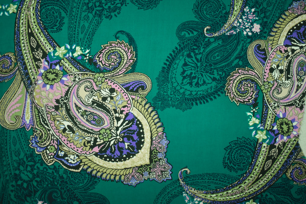 -Green-Pink-Multi Poly Paisley Printed Charmeuse Satin Woven Fabric