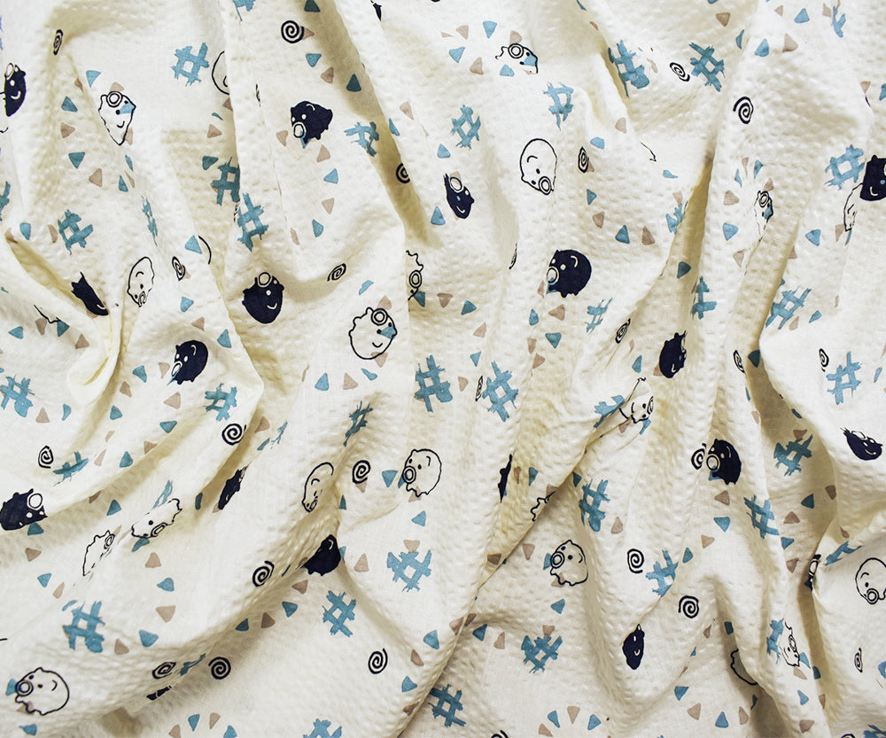 -100% cotton plisse textured woven fabric printed with pig, hashtags, and triangle motifs. Made in Japan.