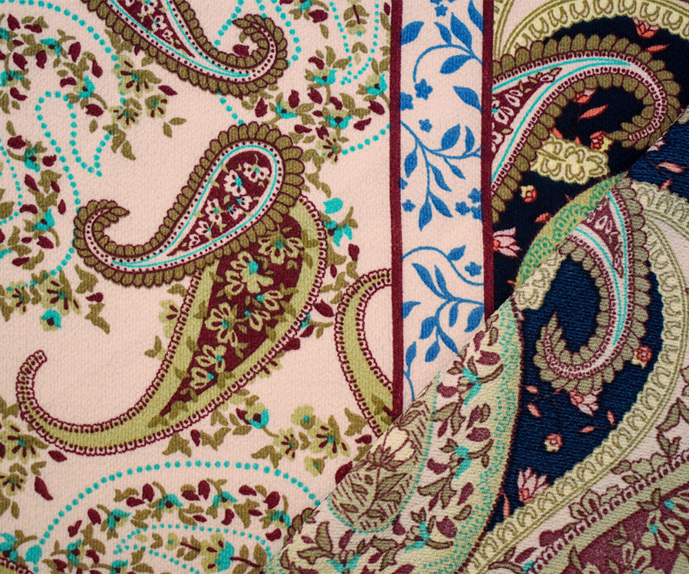 -100% Polyester pebble crepe woven fabric printed with a bordered paisley pattern and leaf motifs