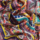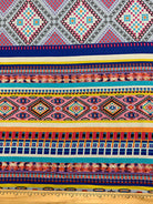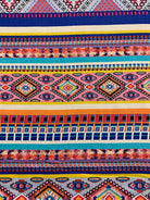 -Pink, Blue, Red, White, Turquoise, Yellow, & Gold Multi Aztec Horizontal Stripe Print Rayon Challis Fabric