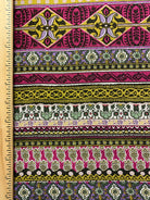 -Purple, Magenta, Brass, Off White, Light Pink, & Brown Multi Horizontal Stripe Print Rayon Challis Fabric