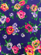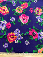 -Fuschia, Pink, Yellow, Orange, Purple, Green, & Beige Digital Floral Print on Purple Rayon Challis Fabric