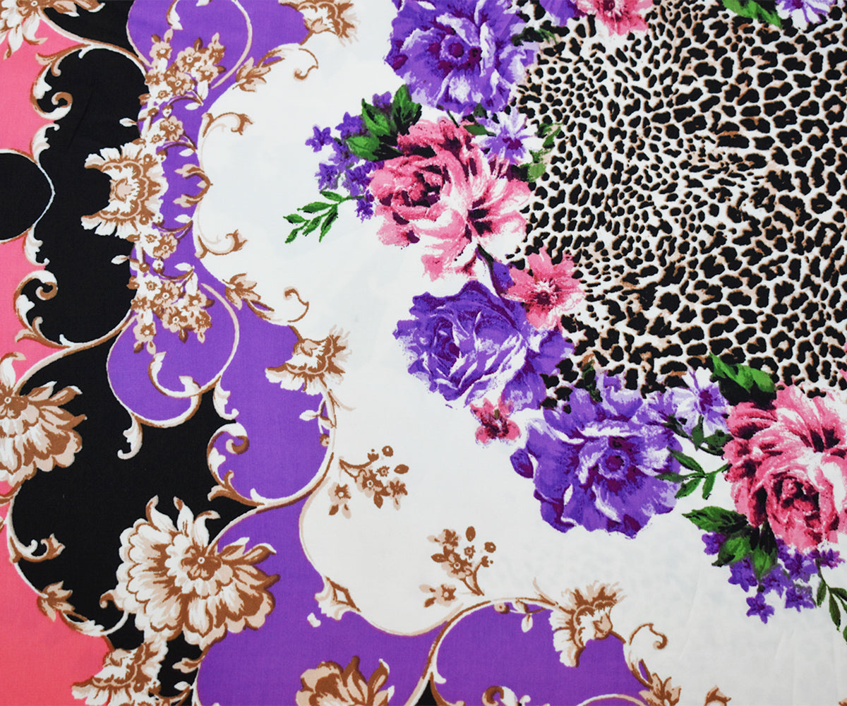 -100% polyester faille woven fabric printed with a floral bordered style pattern with animal prints