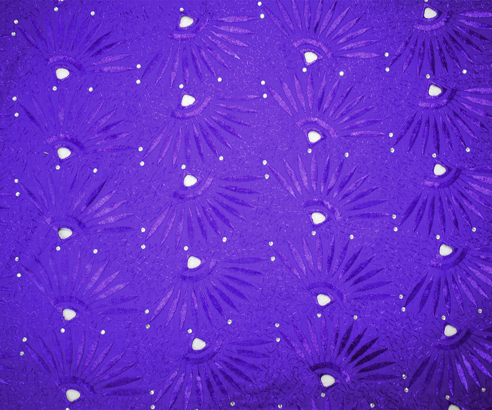 -Polyester and cotton woven fabric embroidered with an African inspired pattern featuring abstract petal-like motifs, abstract shapes, abstract eyelets, scalloped edges, and decorated with hints of rhinestones.