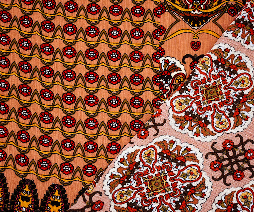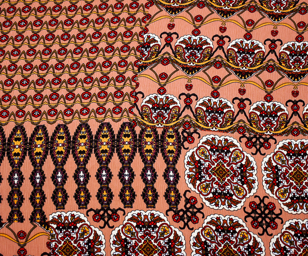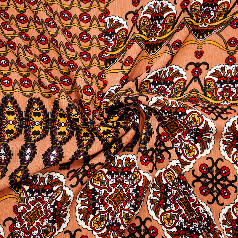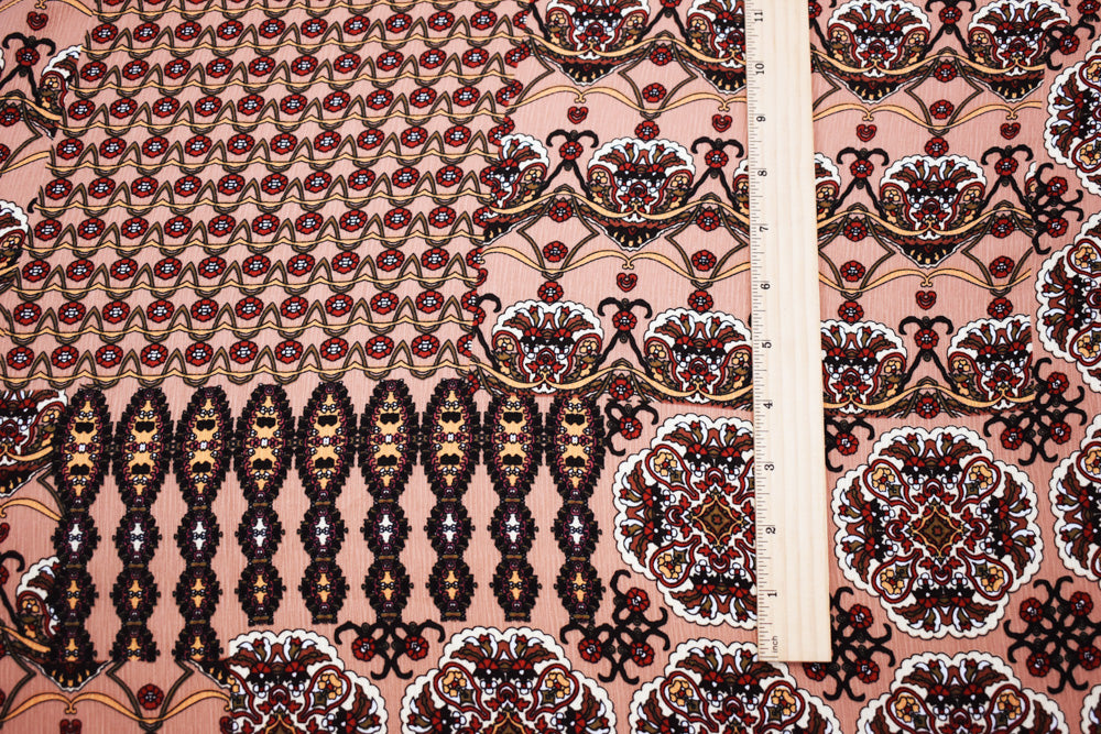 -100% Polyester crinkled dobby crepe woven fabric printed with a multi pattern featuring mandalas, floral elements, & more