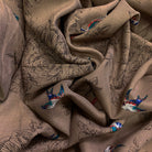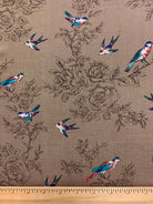 -Red, Brown, Blue, Teal, & Cream Bird Print on Tan Rayon Challis Fabric