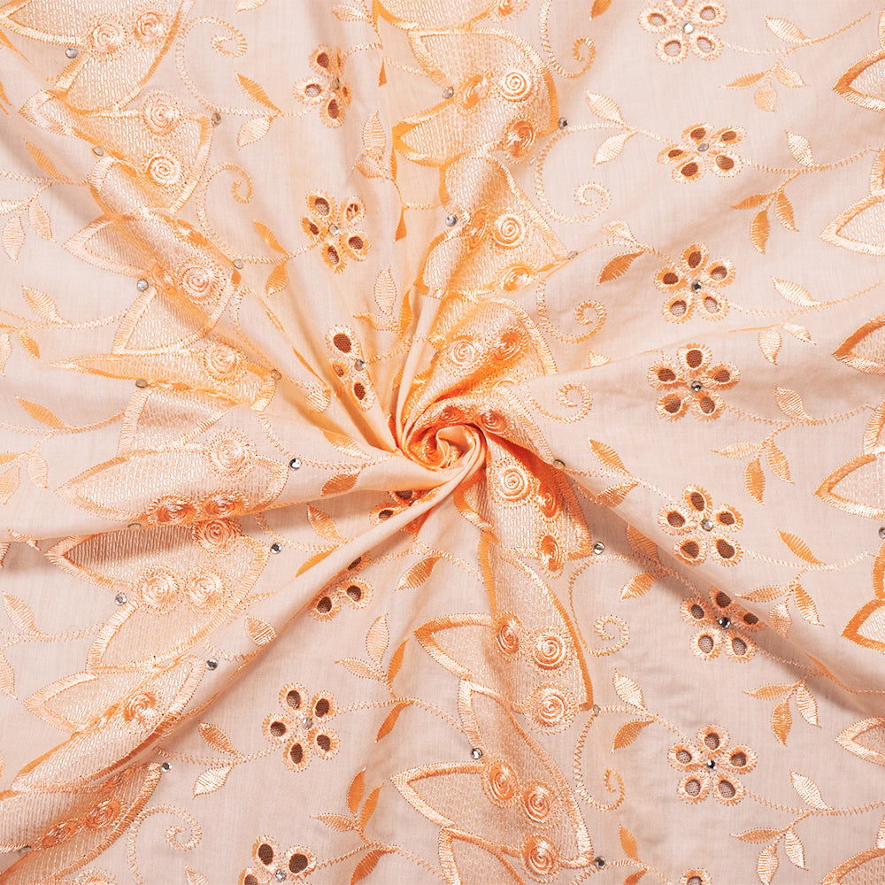 -Poly and cotton blend plain woven fabric embroidered with an African inspired pattern featuring florals, leaf vines, eyelets, scalloped selvedges, with hints of rhinestones.